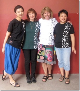 Amy our translater, Susie Davies-Splitter ANCOS presenter, myself and Xu Mai our translator and ANCOS presenter all wearing the ISME Brazil t-shirts Mai and I bought. |